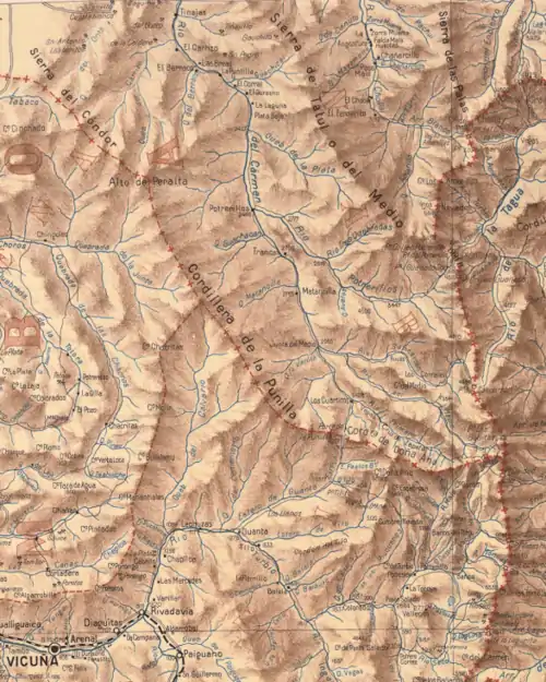 La cordillera de Tatul o del Medio, la Cordillera de Doña Ana y la cordillera de la Punilla, al noreste de la ciudad de Vicuña, en el mapa de Chile de 1910, página 16 de Luis Risopatrón.