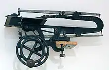 La sierra de marquetería de brazo rígido fue popular hasta la década de 1970, pero ya no se fabrica. Tiene un marco de hierro fundido de una sola pieza. La hoja está unida a un brazo pitman en la parte inferior, que tira de la hoja hacia abajo. Un resorte en la parte superior del brazo tira de la hoja hacia arriba nuevamente. Este diseño tiene una debilidad significativa en el sentido de que la tensión en la hoja cambia con cada golpe; Las sierras de marquetería modernas son diseños de " tensión constante".[3]