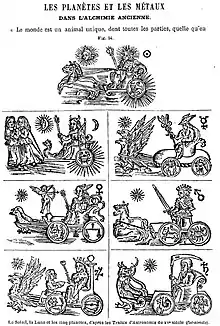 - « Or, argent, chacun des métaux, comme chacune des autres choses, naissent dans le sol sous l'action des dieux célestes et de l'effluence d'en haut. Il est sûr du moins que, à ce que l'on dit, l'or appartient au soleil, l'argent à la lune, le plomb à Saturne, le fer à Mars. Ces métaux sont donc engendrés d'en haut, mais se forment dans la terre, non pas dans ces astres qui envoient ces effluves. » Proclus commentaire sur le Timée IV, 150