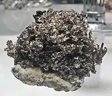La plata existe en estado nativo, se llama plata nativa, y está excepcionalmente presente en una masa importante (es el metal noble más activo químicamente). La plata es más dura que el oro, pero menos que el cobre. Se utiliza principalmente para joyas y monedas. La galena contiene una pequeña cantidad de plata, y su plata se puede extraer por calcinación y oxidación del plomo: es la copelación.[2] La plata nativa fue una fuente de metal de plata, por lo que tenía un verdadero interés comercial. Actualmente, la plata es solo el subproducto de la refinación de los minerales Pb, Cu y Zn.