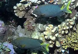 Habitan en aguas tropicales, asociados a arrecifes de coral costeros. Los adultos son vistos normalmente en pareja, y los juveniles y subadultos, forman escuelas, adentrándose en estuarios con algas.[8]