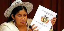 ![]() Silvia Lazarte Flores con la Nueva Constitución Política del Estado Plurinacional de Bolivia. | ||