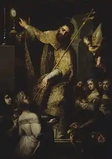 Como obras públicas en la Corte citaba Palomino la del altar mayor de la iglesia del convento de premonstratenses, donde se encontraba pintado un Triunfo de san Norberto de tamaño mayor del natural, con la Herejía vencida a sus pies y la Inmaculada en alto, y otro lienzo en el techo de la antesacristía del mismo convento en el que aparecía San Norberto recibiendo de la Virgen las vestiduras sacerdotales.[6] En la iglesia de los capuchinos del Prado, un lienzo de la Inmaculada; otro de la Virgen en Gloria intercediendo ante su Hijo en favor de las almas de los congregantes se encontraba en el Hospital de la Inclusa, en la Puerta del Sol, y en la antigua iglesia del noviciado de los jesuitas todas las pinturas de la bóveda y cúpula, con una serie de historias de la infancia de Jesús compuesta según Palomino de veintiún lienzos de a cuatro y cinco varas, además del gran lienzo que cubría el altar mayor, con figuras mayores del natural, representando en él la aparición de Cristo con la cruz a cuestas a San Ignacio de Loyola. Son las mismas pinturas que citaba todavía Ceán Bermúdez como existentes en su época, aunque la iglesia de los premonstratenses no era ya la de tiempos de Palomino y el asunto representado en el altar mayor de la iglesia del Noviciado era para Ceán el Martirio de san Ignacio de Antioquía, confundiéndolo quizá con uno de los cuadros pintados por Francisco Rizi para el mismo lugar y aún subsistente.[7][8]