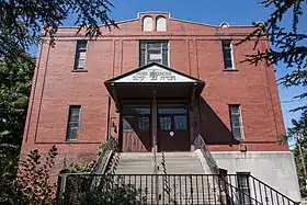 Es una estructura de ladrillo de dos pisos, ubicada sobre un sótano elevado. La fachada principal tiene tres tramos de ancho, con un par de puertas de entrada protegidas por un pórtico simple con techo a dos aguas.[1]