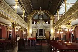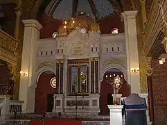 El interior de la sinagoga con su suntuoso acabado está adornado con abundantes patrones pintados en una variedad de colores y hojas de oro. A diferencia del exterior del edificio, su interior, con la excepción del lujoso diseño del techo al estilo morisco, no guaran relación con la arquitectura islámica.[5] El arco sobre el Hejal, con su patrón de casas altas y bajas alternándose, recuerda más al arte folclórico polaco que cualquier estilo islámico. El Hejal forma parte de la reproducción de una muralla, coronada por una gran cúpula y dos más pequeñas, todas hechas de hojas doradas, un elemento similar al de la capilla de Segismundo en la cercana catedral de Wawel.[4][5]
