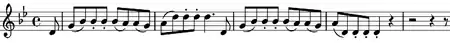 El modo menor vuelve en el minueto que contrasta con el brillante modo mayor del trío que presenta notas agudas para el primer trompa.[3]