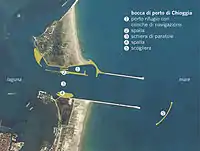 - Tres esclusas pequeñas (dos en Chioggia y una en Lido-Treporti) permiten el tránsito de barcos pesqueros y otras embarcaciones más pequeñas cuando las compuertas están en funcionamiento