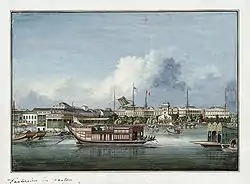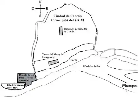 Traza de la ciudad de Cantón a comienzos de siglo XIX. El distrito de las trece factorías está en las afueras del suroeste de la ciudad. El yamen del virrey de Liangguang estaba por aquel entonces situado en el ensanche junto al río, a donde Qianlong lo había trasladado desde la ciudad de Wuzhou en 1747.