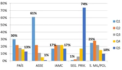 Según distribución poblacional en quintiles de ingreso de hogares, el siguiente gráfico muestra los perfiles de los usuarios beneficiarios del SNIS según el tipo de aseguramiento. Se evidencia una fuerte fragmentación respecto a la mayor presencia del ASSE en los quintiles más bajos y las IAMCs y seguros privados en los quintiles más altos. Respecto al ASSE se observa que el 61% de sus usuarios corresponden al quintil más bajo, y la población de los quintiles más altos, representan un 1% del total de usuarios de este prestador. En los seguros privados observamos que sucede lo contrario, mientras que personas con menos ingresos representan el 1% de sus usuarios, el 74% corresponde al quintil más alto de la población.