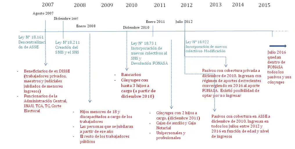 En un comienzo, el Seguro Nacional de Salud ampara a los beneficiarios del Seguro por Enfermedad del Banco de Previsión Social (BPS), los jubilados del BPS de bajos ingresos que hicieran la opción prevista por ley, los funcionarios públicos y otros dependientes del Estado. Con posterioridad a la Ley de Creación del Fondo Nacional de Salud (FONASA), nuevas leyes amplían la población asegurada, incorporando nuevos grupos al Seguro Nacional de Salud. De acuerdo a lo establecido en la Ley 18.211 de Creación del Sistema Nacional Integrado de Salud (SNIS), a partir del 1º de enero de 2008 se incorporaron al Seguro Nacional de Salud los trabajadores privados, los hijos menores de 18 años o discapacitados de cualquier edad a cargo de un beneficiario del Seguro y aquellos activos que se ampararan a partir de esa fecha bajo al régimen jubilatorio. A su vez, dicha Ley previó la incorporación gradual de otros colectivos, como son los cónyuges de los beneficiarios del Seguro Nacional de Salud y aquellos trabajadores comprendidos en otros seguros convencionales (cajas de auxilio). Más recientemente, en enero de 2011, se aprobó la Ley 18.731 que previó la incorporación progresiva de jubilados y pensionistas al Seguro Nacional de Salud. Así, en el 2016 culminó el proceso de incorporación de diferentes grupos poblacionales al SNIS. Hasta el 2017 según el Ministerio de Salud 3.512,437 personas cuentan con cobertura integral en salud, ya sea con cobertura única o cobertura múltiple, dentro del propio sistema.