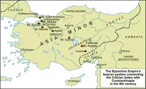 En el siglo IX, durante las guerras árabo-bizantinas, el Imperio bizantino utilizó un sistema de almenaras de balizas para transmitir mensajes desde la frontera con el califato abasí a través de Asia Menor hasta la capital bizantina, Constantinopla.