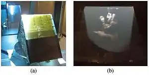 Horizontalmente, la superficie es considerablemente especular para mantener una separación igual en grados entre los diferente puntos de vista. Verticalmente, el espejo se dispersa ampliamente para que la imagen proyectada se pueda ver desde prácticamente cualquier altura.