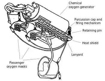 - Un sistema generador de oxígeno químico conectado a todas las máscaras del compartimento. Al tirar hacia abajo de una máscara de oxígeno, se quita el percutor del generador y se enciende una mezcla de clorato de sodio y polvo de hierro, lo que abre el suministro de oxígeno para todas las máscaras en el compartimiento. La producción de oxígeno no se puede interrumpir una vez que se quita una máscara, y la producción de oxígeno suele durar al menos 15 minutos, suficiente para que el avión descienda a una altitud segura para respirar sin oxígeno suplementario. [2] Durante la producción de oxígeno, el generador se calienta extremadamente y se puede notar un olor a quemado y puede causar alarma entre los pasajeros, pero este olor es una parte normal de la reacción química. "Para cualquier avión que lleve más de unos pocos pasajeros, el peso, la complejidad y los problemas de mantenimiento asociados con un sistema de gas comprimido serían prohibitivos. Como consecuencia, la industria depende de generadores químicos de oxígeno ". [3]