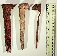 Los clavos utilizados tradicionalmente para fijar los carrilles a las traviesas de madera, son pernos de acero de gran tamaño (del orden de 15 cm) con caras lisas, y disponen de una cabeza desplazada lateralmente que sirve para asegurar la parte inferior del raíl. La invención de este tipo de clavo se le atribuye A Robert Livingston Stevens,[6] utilizado por primera vez en 1832.[7] Por aquel entonces, los ferrocarriles ingleses utilizaban placas de asiento de hierro fundido pesadas y costosas para asegurar los rieles en forma de T. Stevens halló una solución mucho más simple, agregando una base de soporte al riel en T, que de esta manera podía fijarse con un simple clavo.[8][9] La generalización de este invento se debió en parte al incipiente estado de industrialización de los Estados Unidos a comienzos del siglo XIX, circunstancia que primó la utilización de materiales de construcción sencilla. En 1982, los clavos seguías siendo la fijación de carril más común en América del Norte. Son de sección cuadrada, con tamaños de entre 14 y 16 mm de lado, y longitud comprendida entre los 140 y los 150 mm.[10]: 582–3