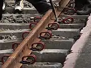 En trabajos localizados, los clavos todavía se introducen en las traviesas de madera martilla con una maza especial parecida a un pico, aunque este trabajo manual ha sido reemplazado en gran medida por herramientas hidráulicas[12] capaces tanto de introducir clavos como de extraerlos.[13] Para evitar que se abran las traviesas de madera al introducir los clavos, es habitual prepararlas con agujeros previamente taladrados, y colocar cinchas de acero tensadas especialmente alrededor de sus extremos.[10] : 455