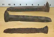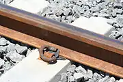 Un clavo ferroviario tiene forma de cincel y la punta plana. Se introduce con los bordes perpendiculares al sentido de las vetas de la madera, lo que le da mayor resistencia al aflojamiento.[11] Su función principal es mantener la distancia entre los dos carriles de acuerdo con el ancho nominal de la vía. Cuando se utilizan para fijar las placas de unión, el accesorio se hace lo más fuerte posible, mientras que cuando sujetan el carril a la placa de asiento, normalmente permiten que el raíl disponga de una mínima libertad de movimiento.[10] : 455, 581–2