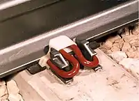 En durmientes de madera, siempre es una fijación indirecta. La parte metálica que presiona sobre el patín del carril se mantiene bajo presión mediante un resorte helicoidal atornillado.