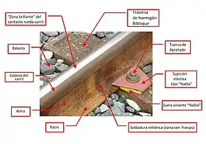 - Sistemas de tornillos de metal más o menos complejos para ciertos tipos de traviesas de hormigón, e instalación indirecta en traviesas de madera.