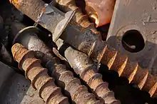 Los tornillos de anclaje son pernos roscados, normalmente de cabeza cuadrada o hexagonal, que se insertan a través de un orificio practicado en una traviesa, y que se sujetan por su otro extremo mediante una tuerca con las caras dentadas, diseñadas para hincarse en la superficie inferior del durmiente. Para sujetar los carriles de base plana, se usan unas arandelas labiadas que aprisionan el borde del carril. Este tipo de sujeciones son más resistentes al aflojamiento provocado por las vibraciones y el movimiento del carril,[20] por lo que se utilizan en lugares donde el paso de los trenes implica mayores esfuerzos mecánicos, como en los aparatos de vía[21] y en las curvas cerradas.[22]