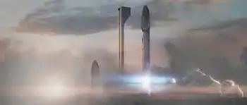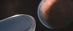 - Elon Musk (27 de septiembre de 2016). Making Humans a Multiplanetary Species (video). IAC67, Guadalajara, Mexico: SpaceX. Escena en 9:20–10:10. Consultado el 10 de octubre de 2016. «So it is a bit tricky. Because we have to figure out how to improve the cost of the trips to Mars by five million percent ... translates to an improvement of approximately 4 1/2 orders of magnitude. These are the key elements that are needed in order to achieve a 4 1/2 order of magnitude improvement. Most of the improvement would come from full reusability—somewhere between 2 and 2 1/2 orders of magnitude—and then the other 2 orders of magnitude would come from refilling in orbit, propellant production on Mars, and choosing the right propellant. ».