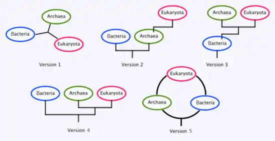 Existen varios postulados diferentes sobre la relación filogenética entre los tres dominios, los cuales pueden resumirse cronológicamente del siguiente modo: