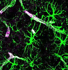 Los astrocitos generan una interfaz en la sinapsis neuronal, así como proyecciones conocidas como "end-feet" que recubren completamente la vasculatura del cerebro. Aunque el mecanismo completo no ha sido comprendido en su totalidad, los astrocitos son conocidos por facilitar los cambios en el flujo sanguíneo[13][14] y se cree que desempeñan un papel en la eliminación de desechos en el cerebro.[15]