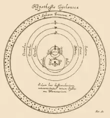 A finales de la década de 1570, Tycho desarrolló un sistema «geo-heliocéntrico» como alternativa del sistema geocéntrico de Ptolomeo, que hoy es conocido como el «sistema ticónico». En este, el Sol, la Luna y las estrellas orbitan alrededor de la Tierra, mientras que los otros cinco planetas orbitan el Sol.[21] Las diferencias esenciales entre el cielo y la Tierra se mantuvieron: con el movimiento solo siendo posible en un cielo etéreo y una Tierra demasiado grande y pesada para poder moverse. Tycho sostuvo que este sistema que no violaba ni las leyes de la física ni las sagradas escrituras, con las estrellas localizadas justo después de Saturno y de un tamaño razonable.[22][23]