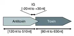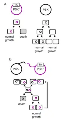 Un sistema toxina-antitoxina es un conjunto de dos o más genes unidos, que codifican para una proteína 'veneno' y su 'antídoto' correspondiente. Cuando estos sistemas se encuentran en plásmidos –elementos genéticos transferibles– aseguran que únicamente las células hijas que heredan el plásmido sobrevivan después de la división celular. Si el plásmido está ausente en una célula hija, la antitoxina 'inestable' se degrada y la proteína tóxica 'estable' ataca y elimina a la nueva célula; esto es conocido como 'exterminio post - segrgacionista' (PSK).[2][3] Los sistemas toxinas-antitoxinas se encuentran distribuidos extensamente en procariontes y los organismos normalmente los contienen en diferentes copias.[4][5]
