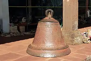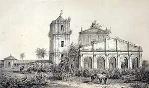 - "Frente a una gran plaza cuadrangular, en el que desembocan nueve calles, se veía en el templo, así que de paredes de barro y piedra, pero muy gruesas, y blanqueadas de tabatinga [...] la iglesia es de tres naves, de trescientos cincuenta palmos de longitud, y ciento y veinte de ancho, con cinco altares de talla dorada, y excelentes pinturas. [...] La torre también de piedra con seis campanas".