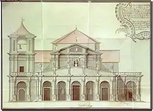 - "La iglesia es muy grande, toda en piedra grês, con tres naves en forma de media naranja, muy bien pintada y dorada, con un magnífico pórtico y de bellísima arquitectura; las bóvedas en forma de media naranja son de madera, el altar mayor es de ranuras sin que se doren, a falta de la última parte: en el crucero hay tres altares esculpidos, dos en estilo italiano, también de oro".