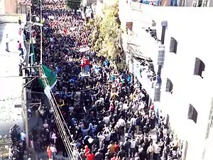 El 15 de marzo de 2011, un movimiento de protesta contra el gobierno sirio comenzó a intensificarse, ya que se llevaron a cabo manifestaciones simultáneas en las principales ciudades de Siria. Los principales problemas incluyen la corrupción del gobierno y la represión.[37] Las protestas se extendieron a Homs el 18 de marzo, después de las llamadas en línea para un "Viernes de la Dignidad" (en árabe, جمعة الكرامة). Miles de manifestantes salieron a las calles después de las oraciones del viernes. En un intento por dispersar a la multitud, la policía realizó muchos arrestos y asaltó a los manifestantes.[38] A medida que continuaban las protestas en abril, las fuerzas de seguridad dispararon contra los manifestantes, lo que resultó en decenas de muertes. Homs se convirtió en una de las ciudades más tranquilas de Siria, y algunos activistas la denominaron "Capital de la Revolución".[39]