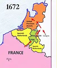 Las alianzas con Münster y el Electorado de Colonia permitieron a los franceses sortear las defensas de los Países Bajos españoles cuando invadieron la República Holandesa en mayo de 1672. Parecían haber logrado una victoria abrumadora, pero el ejército holandés se retiró entonces detrás de la Línea de Agua holandesa y las puertas se abrieron el 22 de junio, inundando el terreno e impidiendo nuevos avances. El 4 de julio, Guillermo de Orange fue nombrado Estatúder y repelió una fuerza de invasión desde Münster, recuperando la mayor parte del territorio perdido en junio.[3]
