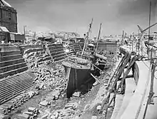 ![]() Una calle muy dañada por las bombas en Valletta, Malta. Esta calle es Kingsway, la calle principal en La Valeta. El personal de servicio y los civiles están presentes limpiando los escombros. Abril de 1942. | ||||