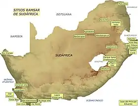 En Sudáfrica había, a finales de 2019, 26 sitios Ramsar que cubrían una superficie de unos 5.630 km² aproximadamente.[1] Los tres últimos (las islas Dassen y Geyser, y el monte Kgaswane) fueron añadidos en 2019.[2] Cuatro de estos lugares, la Playa de las Tortugas y arrecifes de coral de Tongaland, el sistema lagunar de Kosi Bay, el sistema del lago Santa Lucia y el lago Sibaya, forman parte del Parque del Humedal de iSimangaliso,[3] patrimonio de la Humanidad, que ocupa 280 km de costa y cubre 3.280 km².