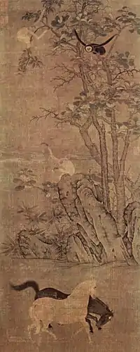 Al igual que sus habilidades intelectuales, la gente exhibió hábitos y pasatiempos culturales que marcaron su estatus sociales y refinamiento. El término erudito 'nueve invitados' (jiuke)—una extensión de las Cuatro Artes de la Academia China—fue una metáfora para los pasatiempos de la gente como la cítara china, el ajedrez chino, meditación budista zen, tinta (caligrafía y pintura), casas de té, alquimia, canto poético, conversaciones, y salas de vino.[54] La producción pictórica de la alta burguesía cambió radicalmente de estilo entre el periodo Norte y el Sur durante la dinastía Song, debido a las circunstancias políticas, demográficas y sociales subyacentes. La alta burguesía y los funcionarios del Song del Norte, que estuvieron en gran medida interesados en abordar asuntos de interés nacional y no tanto en temas locales, prefirieron pintar escenas paisajísticas enormes donde las personas aparecían totalmente reducidas.[55] Durante el periodo Sur, los intereses políticos, familiares y sociales se vieron muy influidos por asuntos más locales; estos cambios se vieron reflejados en el principal estilo pictórico del periodo Sur, en el que las escenas pequeñas e íntimas situaron su foco principal sobre las personas.[55]