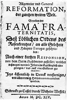 - Fama Fraternitatis (Fama fraternitatis Roseae Crucis oder Die Bruderschaft des Ordens der Rosenkreuzer)