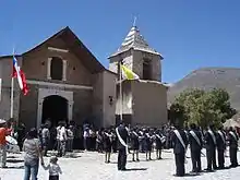 Fue construida sobre una plataforma artificial en 1560, desde donde se tiene una impresionante vista hacia los cultivos en terrazas que bajan hasta el fondo de la quebrada del río Socoroma. La iglesia en adobe y portal en piedra tallada fue restaurada en 1883.[1] Su dimensión (32 m al interior), y estilo, semejante a la de Putre, revelan la presencia hispana en este entonces. Destaca la puerta lateral con marco y un arco superior en piedra tallada, con signos y nombres de evangelistas. En el interior hay un altar de adobe y piedra y cuatro imágenes con coronas de plata, además de cuadros cuzqueños en muros, más las imágenes y objetos de un antiguo esplendor como la curiosa águila tallada en madera policromada usada como candelabro.