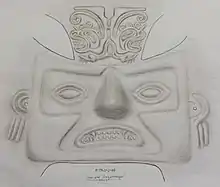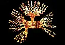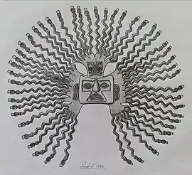 ![]() Dibujo del Sol de oro como habría sido antes de sufrir daños por la actividad de los huaqueros. | ||