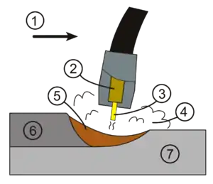 La distancia entre la punta del tubo de contacto hasta el arco es controlada por el operario, pero la longitud del arco es controlada automáticamente por los parámetros regulados en la máquina.
