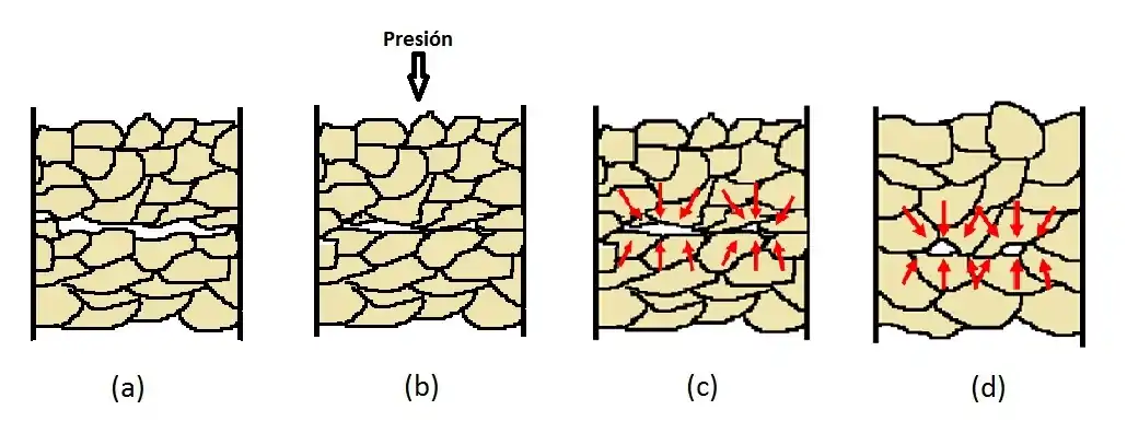 - Una vez obtenidas las superficies lo suficientemente comprimidas a temperaturas altas, los átomos se difunden a través de los límites del grano, este paso suele suceder con mucha rapidez aislando los huecos producidos por la difusión en los límites del grano.