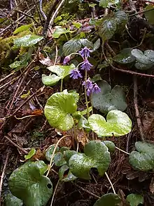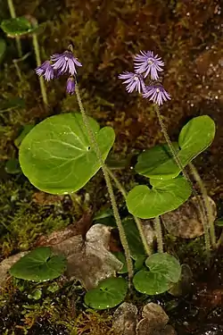 Planta herbácea perenne. Desarrolla rizomas subterráneos de los que surgen rosetas de hojas provistas de peciolos reniformes de 5-15 cm, con pelos glandulíferos de hasta 1 mm. La inflorescencia está formada por 1 a 5 flores inclinadas, agrupadas en forma de umbela al final de un largo escapo. El cáliz, de 5 mm, está formado por 5 sépalos iguales más o menos triangulares y de color verde. Cinco pétalos de color lilacino, profundamente recortados en estrechos lóbulos. Fruto en cápsula alargada y acrescente.[2][3]