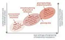 En 2014-2015, la red europea BiodivERsA [35] movilizó a numerosos científicos, donantes de investigación y partes interesadas, proponiendo una tipología que caracteriza las NBS a lo largo de dos gradientes: [14]
