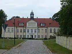 Se encuentra a poca distancia al sureste de la frontera con el distrito de Rostock.