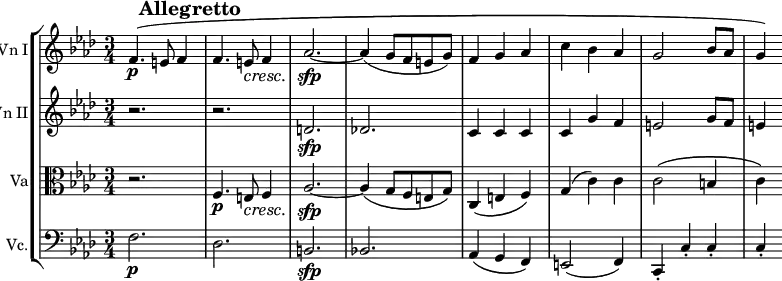 Beethoven, Op. 14 Núm. 1, 2.º movimiento, compases 1–8, versión de Cuarteto |