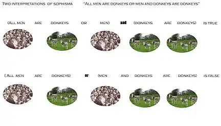 (En latín : Omnes homines sunt asini vel homines y asini sunt asini )[2] es un sofisma que primero fue propuesto y resuelto por el filósofo del siglo XIV, Alberto de Sajonia, un filósofo alemán conocido por sus contribuciones a la lógica y la física , y su solución puede haber sido influenciada por las obras de su compañero lógico Jean Buridan. Este caso es un ejemplo de la segunda clase de sofismata; una oración ambigua que está abierta a más de una interpretación y podría ser verdadera o falsa dependiendo de qué interpretación se elija.