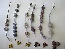 Produce flores zigomorfas amarillas agrupadas en racimos colgantes y su fruto es una legumbre densamente pubescente con estrangulaciones entre cada septo, el cual contiene normalmente, más de 4 semillas ovaladas, de color castaño-amarillenta.