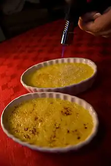 Los sopletes de butano se usan frecuentemente como utensilios de cocina para al cocinar caramelizar azúcar, por ejemplo al elaborar creme brulee.[1] Se pueden comercializar como sopletes de cocina, sopletes para cocinar o sopletes culinarios. El uso del soplete de butano en la cocina no se limita a caramelizar azúcar ya que también puede utilizarse para fundir o dorar coberturas en casseroles o sopas, queso, rostizar o quemar[2] vegetales tales como el pimiento, etc.[3]