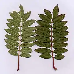 Es un pequeño árbol caducifolio que alcanza un tamaño de, por lo general de corta duración caduca árbol de crecimiento de 6-8 m de altura, con un tronco de hasta 25 cm de diámetro. La corteza es lisa de color gris o rojo-gris. Las hojas de 15-23 cm de largo, pinnadas con 15-21 folíolos, de color verde oscuro por el haz y más claras por el envés, el peciolo de color rojizo, los foliolos de 3-5.5 cm de largo y 1,5-2 cm, con el margen serrado. Las flores tienen 7-10 mm de diámetro, con cinco pétalos de color rosa muy pálido y estambres amarillento pálido, se producen en corimbos en primavera. La polinización es efectuada por insectos. El fruto es un pomo de color blanco a blanco-rosado de 12-15 mm de diámetro, la maduración se produce en el otoño y con frecuencia persiste mucho después de la caída de las hojas en invierno.[2][3][4]