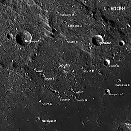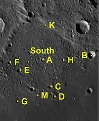 Por convención estos elementos son identificados en los mapas lunares poniendo la letra en el lado del punto medio del cráter que está más cercano a South.
