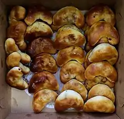 - El cocinero toma unas tazas de masa y extiende todo el bulto con un rodillo, o solo el borde del bulto con un vaso. El cocinero toma una cucharada de relleno y la coloca sobre la masa a unos 3 centímetros de uno de los bordes. El cocinero dobla el borde de la masa sobre el relleno, pone un vaso sobre la masa y la pila de relleno y corta las dos capas de masa de un lado con el vaso para crear una masa en forma de media luna. La presión del vidrio que corta a través de la masa aprieta las dos capas de masa juntas por un lado abierto. La masa se reforma ligeramente para formar una forma oblonga o de media luna.